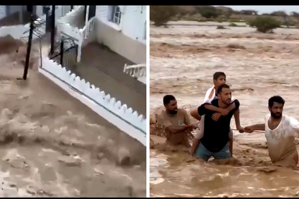 غیر ملکی میڈیا رپورٹس کے مطابق عمان میں گزشتہ دو روزسے جاری بارشوں سے نظام زندگی مفلوج ہوکررہ گیاہے،بارشوں کے کئی علاقوں کو سیلابی صورتحال کا سامنا ہے،سوشل میڈیا پر وائرل ویڈیوز میں دیکھا جاسکتا ہےکہ سٹرکوں پر گاڑیاں سیلابی ریلوں میں بہہ رہی ہیں،جبکہ ہزاروں لوگ گھروں میں محصور ہو کررہ گئے ہیں۔