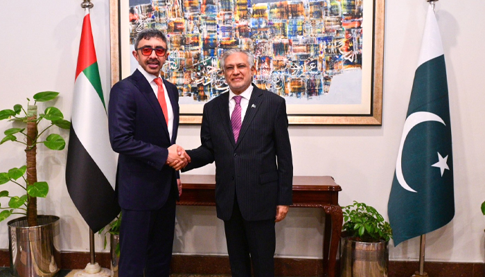 قبل ازیں متحدہ عرب امارات (یو اے ای) کے نائب وزیراعظم شیخ عبداللہ بن زاید النہیان دفتر خارجہ پہنچے جہاں نائب وزیراعظم اسحاق ڈار نے مرکزی دروازے پر معزز مہمان کا استقبال کیا، دونوں رہنماؤں نے گرمجوشی سے مصافحہ کیا۔