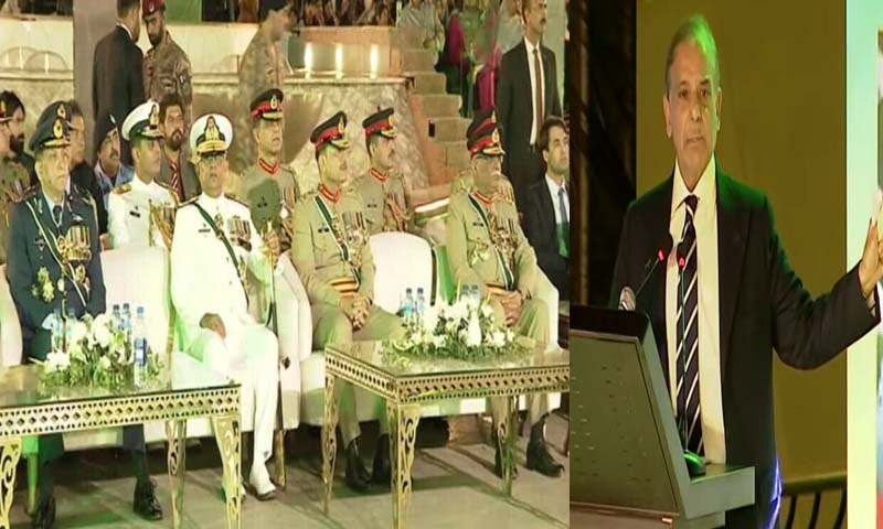 وزیراعظم نے کہا کہ اس کے بعد جنرل عاصم منیرنے مجھ سے کہا کہ اجازت دیں کہ دشمن کے منہ پر ہم ایسا تھپڑ رسید کریں گے کہ وہ عمر بھر یاد رکھے گا، اور پھر آپ نے دیکھا کہ کس طرح پٹھان کوٹ، ادھم پور اور دوسرے مقامات پر ہمارے شاہینوں اور الفتح میزائلوں نے حملے کیے اور دشمن کو سر چھپانے کی جگہ نہیں مل رہی تھی۔انہوں نے کہا کہ جنرل عاصم منیر کا پھر مجھے فون آیا اور کہا کہ ہم نے دشمن کو بھرپور جواب دیا ہے اور اب ہمیں سیز فائر کرنے کی درخواست کردی ہے، میں نے کہا کہ اس سے بڑی عزت کی کیا بات ہوسکتی ہے کہ آپ نے دشمن کو سیزفائر پر مجبور کردیا ہے، میں نے کہا کہ آپ سیزفائر کی پیشکش کو قبول کرلیں۔شہباز شریف نے کہا کہ ہمارے ایئرچیف اور ان کے شاہینوں نے جس طرح ملک میں تیار کردہ ٹیکنالوجی کو چینی طیاروں کے ساتھ استعمال کیا اس سے دنیا کے ہوش اڑگئے اور دوستوں کا اعتماد آسمان سے باتیں کرنے لگا، امریکا سے لے کر جاپان تک اور ہر جگہ آج یہ بات ہورہی ہے کہ پاکستان کی افواج نیکس طرح خاموشی سے یہ صلاحیت کرلی۔