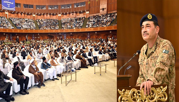 چیف آف آرمی اسٹاف اور چیف آف ڈیفنس فورسز فیلڈ مارشل عاصم منیر نے قومی علما و مشائخ کانفرنس سے خطاب کرتے ہوئے کہا کہ ریاست طیبہ اور ریاست پاکستان کا آپس میں ایک گہرا تعلق ہے اور دفاعی معاہدہ تاریخی ہے۔فیلڈ مارشل عاصم منیر نے کہا کہ اللہ تعالی نے تمام مسلم ممالک میں سے محافظین حرمین کا شرف پاکستان کو عطا کیا ہے، جس قوم نے علم اور قلم کو چھوڑا تو انتشار اور فساد الارض نے وہاں جگہ لی۔انہوں نے کہا کہ عزت اور طاقت تقسیم سے نہیں، محنت اور علم سے حاصل ہوتی ہے، دہشت گردی پاکستان کا نہیں ہندوستان کا وطیرہ ہے، ہم دشمن کو چھپ کر نہیں للکار کر مارتے ہیں۔