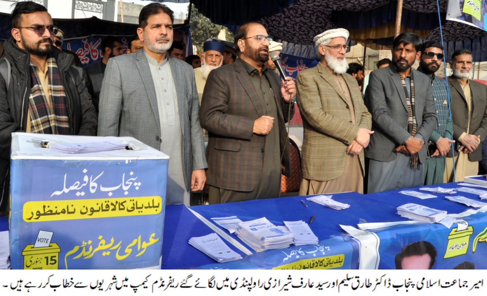 شہریوں سے خطاب کر تے ہو ئے امیر جماعت اسلامی پنجاب ڈاکٹر طارق سلیم نے کہا ہے کہ عوام نے بلدیاتی قانون کو مسترد کیا تو جماعت اسلامی پنجاب اسمبلی کے گھیراؤ کا اعلان کرے گی اور پنجاب کی جعلی حکومت کے بنائے گئے کالے قانون کی واپسی تک گھیراؤ جاری رکھا جائے گا، پنجاب کے عوام گزشتہ دس برس سے بلدیاتی انتخابات اور حق حکمرانی سے محروم ہیں،حکمران سیاسی پارٹیاں عوام تو درکنار اپنی پارٹیوں کے کارکنوں کو بھی اختیار نہیں دینا چاہتیں، انھوں نے مطالبہ کیا کہ پنجاب کا عوام دشمن بلدیاتی قانون واپس لیا جائے اور صوبہ میں بلدیاتی انتخاب کی حتمی تاریخ کا اعلان کیا جائے،پنجاب کے بلدیاتی قانون میں غیرجماعتی انتخابات تجویز کیے گئے ہیں، یونین کونسل کا چیئرمین بھی عوام کے براہ راست ووٹ سے منتخب نہیں ہوگا، آئین میں بااختیار بلدیاتی حکومتوں کی بات کی گئی ہے تاہم صوبائی حکومتیں اس سے منحرف ہیں، پنجاب میں گزشتہ دس برس سے بلدیاتی انتخاب نہیں ہوا۔ اختیارات پر افسرشاہی قابض ہے،ڈاکٹر طارق سلیم نے کہا جمہوریت اور آئین دشمن بلدیاتی قانون کے خلاف پنجاب میں بڑے پیمانے پر بیداری کی لہر ہے اور موثر بلدیاتی نظام کے مطالبہ کی لہر پورے ملک میں پھیل رہی ہے، صوبائی حکومتیں اختیارات پر قابض ہیں، پنجاب کے علاوہ دیگر صوبوں میں بھی بلدیاتی نظام نہ ہونے کے برابر ہے، عوامی ریفرنڈم کے ذریعے باشعور عوام ایک دوٹوک پیغام دیں گے کہ وہ اس بلدیاتی قانون کو کسی صورت قبول نہیں کریں گے، انھوں نے خبردار کیا کہ اگر حکومت نے عوام کی رائے کو نظرانداز کیا تو جماعت اسلامی اپنی جدوجہد کو مزید منظم اور وسیع کرے گی، ان کا کہنا تھا کہ یہ تحریک صرف جماعت اسلامی کی نہیں بلکہ پنجاب کے عوام کے حق حکمرانی کی جدوجہد ہے، اور عوامی ریفرنڈم اس بات کا ثبوت ہے کہ پنجاب کے عوام بیوروکریسی راج نہیں بلکہ ایک بااختیار اور مضبوط بلدیاتی نظام چاہتے ہیں۔