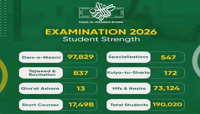 پاکستان میں تجوید و قرات ، درس نظامی، تخصصات اور کلی الشریعہ کا امتحان دینے والے طلباو طالبات کی تعداد 99 ہزار 398 ہے جبکہ ناظر القرآن اور تحفیظ القرآن کا امتحان دینے والے طلباو طالبات کی تعداد 73ہزار 124 ہے، اسی طرح امامت کورس اور فیضان شریعت کے شارٹ کورسز کا امتحان دینے والے طلباو طالبات کی تعداد 17ہزار 498ہے، واضح رہے کہ کنز المدارس بورڈ کے تحت امسال امتحان دینے والے کل 1لاکھ 90 ہزار 20 امیدوار ہیں جس کیلئے ملک بھر میں 884امتحانی سنٹر قائم کئے گئے جن میں امتحانی عملے کی تعداد 4463 ہے۔ امتحانات کے حوالے سے کنز المدارس انتظامیہ کی جانب سے تمام انتظامات مکمل کر لئے گئے ہیں۔