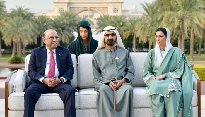 بدھ کو ایوان صدر سے جاری بیان کے مطابق صدر مملکت آصف علی زرداری نے دورہ متحدہ عرب امارات کے دوران اماراتی وزیراعظم شیخ محمد بن راشد المکتوم سے ملاقات کی۔ اس ملاقات میں خاتون اول بی بی آصفہ بھٹو زرداری ،چیئرمین پیپلز پارٹی بلاول بھٹو زرداری اور یو اے ای میں پاکستان کے سفیر بھی موجود تھے۔ملاقات کے دوران دونوں رہنماوں نے پاکستان اور متحدہ عرب امارات کے درمیان اقتصادی، تجارتی اور سرمایہ کاری کے تعاون کو وسعت دینے پر گفتگو کی جب کہ ملاقات میں دو طرفہ تعلقات کو مزید مضبوط بنانے کے طریقوں پر بھی تبادلہ خیال ہوا۔
