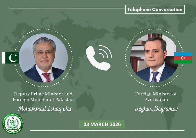 ہومتازہ ترینوزیر خارجہ اسحاق ڈار کا آذربائیجان کے ہم منصب جیہون بیراموف سے رابطہ، موجودہ علاقائی صورتحال پر بات چیت