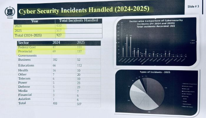 صرف دو سائبر حملوں میں ویب سائٹس مکمل طور پر بند ہوئیں،سائبر حملوں کی روک تھام کے لیے نیشنل سرٹ متحرک ،نیشنل سرٹ نے ڈیٹا سیکیورٹی اور آن لائن نظام مضبوط بنانے لیے اداروں کو ہدایات جاری کردیں،سال 2024 میں سائبر سیکیورٹی کے مجموعی طور پر 410واقعات رپورٹ ہوئے تھے ،سال 2025میں سائبرسیکیورٹی کے مجموعی طور پر 517واقعات رپورٹ ہوئے تھے، سال 2024 میں وفاقی حکومت کے خلاف 47اور صوبائی حکومتوں کے خلاف 69سائبر حملے رپورٹ ہوئے تھے ،سال 2025میں وفاقی حکومت کے خلاف 111اور صوبائی حکومتوں کے خلاف 137سائبر حملے رپورٹ ہوئے تھے۔