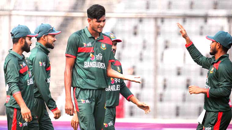 قبل ازیں ڈھاکہ کے شیر بنگلہ سٹیڈیم میں کھیلے جانے والے میچ میں بنگلہ دیش نے پاکستان کے خلاف ٹاس جیت کر پہلے فیلڈنگ کا فیصلہ کیا ہے تاہم پہلے بیٹنگ کرتے ہوئے پاکستان کی پوری ٹیم 30.4 اوورز میں 114 رنز بناکر ڈھیر ہوگئی۔قومی ٹیم کی جانب سے صاحبزادہ فرحان اور معاز صداقت کے پہلی وکٹ کی شراکت میں 41رنز جوڑے گئے تاہم صاحبزادہ فرحان کے بعد رضوان کے آوٹ ہوتے ہی بیٹنگ لائن لڑ کھڑا گئی اور82کے مجموعی سکور پر 9کھلاڑی آوٹ ہوگئے جس کے بعد ابرار احمد اور فہیم اشرف کی شراکت ٹیم کو 115رنز تک لے کر گئی۔