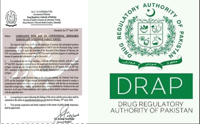 تفصیلات کے مطابق ڈرگ ریگولیٹری اتھارٹی نے جعلی اور غیر معیاری مصنوعات کے خاتمے کے لیے قائم نیشنل ٹاسک فورس کو روایتی ڈسپوزایبل سرنجوں پر پابندی کے احکامات پر عمل درآمد یقینی بنانے کیلئے جامع ملک گیر مارکیٹ سروے کر نے اور ایسی مصنوعات کی نشاندہی کر نے کی ہدایت کی ہے جو پابندی کے باوجود فروخت یا تقسیم کی جا رہی ہیں۔ ڈریپ کی طرف سے جاری مراسلے میں کہا ہے کہ ٹاسک فورس اس حوالے سے قابل اطلاق قوانین کے مطابق سخت ریگولیٹری کارروائی شروع کرے۔