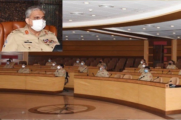 پاک فوج کے شعبہ تعلقات عامہ (آئی ایس پی آر)کی طرف سے جاری کردہ بیان کے مطابق آرمی چیف جنرل قمر جاوید باجوہ کی صدارت میں 244 ویں کور کمانڈرز کانفرنس جنرل ہیڈ کوارٹرز (جی ایچ کیو)میں ہوئی۔آئی ایس پی آر کے مطابق کور کمانڈرز کانفرنس کے دوران شرکا نے بارڈر مینجمنٹ اور داخلی سلامتی پر خصوصی توجہ کے ساتھ خطے میں سکیورٹی کی ابھرتی ہوئی صورتحال کا جائزہ لیا۔ سپہ سالار نے فارمیشنز کی آپریشنل تیاریوں کو سراہا اور غیرملکی افواج کیساتھ تعاون اورمشترکہ مشقوں کے انعقاد میں اضافے پر زور دیا۔پاک فوج کے شعبہ تعلقات عامہ کے مطابق کور کمانڈرز کانفرنس کے دوران ملک کو غیر مستحکم کرنے، امن و استحکام کو خراب کرنے کے لیے دشمن قوتوں کے مذموم عزائم کو ناکام بنانے کے لیے کیے جانے والے اقدامات سے آگاہ کیا گیا۔آئی ایس پی آر کے مطابق کور کمانڈرز کانفرنس میں بھارتی فوج کے پاکستان مخالف پروپیگنڈے کا بھی نوٹس لیا گیا اور ملکی، علاقائی سالمیت کی حفاظت کے لیے تمام ضروری اقدامات کرنے کا عزم ظاہر کیا۔آرمی چیف کا کہنا تھا کہ بھارت مقبوضہ کشمیر میں انسانی حقوق کی خلاف ورزیوں کے باعث داخلی تضادات کا شکار ہے اور پاکستان کے خلاف پروپیگنڈا بھارتی فوج کی بوکھلاہٹ کو ظاہر کرتا ہے، بھارتی فوج کی ہرزہ سرائی داخلی مسائل سے توجہ ہٹانے کی کوشش ہے۔کانفرنس کے شرکا کا کہنا تھا کہ پاکستان کی علاقائی سالمیت کے لیے تمام اقدامات کیے جائیں گے اور قربانیوں سے حاصل امن و استحکام کو تباہ کرنے کی سازش ناکام بنادیں گے۔ کانفرنس میں علاقائی سیکیورٹی، بارڈر مینجمنٹ اور داخلی سیکیورٹی اور تیزی سے بدلتی صورتحال پر تفصیلی بات چیت کی گئی۔ کور کمانڈرز نے افغانستان میں سلامتی کی صورتحال پر تشویش کا اظہار کرتے ہوئے کہا کہ افغانستان میں امن و استحکام کے لیے عالمی برادری کا تعاون ضروری ہے۔ افغانستان کے ساتھ عالمی تعاون خطے کے مفاد میں ہے۔علاوہ ازیںآئی ایس پی آرکی طرف سے جاری کردہ بیان کے مطابق آرمی چیف سے سعودی رائل نیول فورسز کے کمانڈر نے ملاقات کی، اس دوران باہمی دلچسپی امور پر تبادلہ خیال کیا گیا۔آئی ایس پی آر کے مطابق ملاقات میں افغانستان کی صورتحال، علاقائی سکیورٹی کی صورتحال، افواج میں تعاون پر بھی تبادلہ خیال کیا گیا۔ ملاقات میں سمندری امور بھی زیر غور آئے۔آئی ایس پی آر کے مطابق سعودی کمانڈر نے افغان صورتحال خاص کر غیر ملکیوں کے انخلا میں پاکستان کے کردار کو سراہا، سعودی کمانڈر نے علاقائی امن کے لیے پاکستان کے ساتھ مل کر کام کرنے کے عزم کا اعادہ کیا، ملاقات میں دونوں ممالک کے درمیان دفاعی تعاون کے فروغ کے عزم کا اعادہ کیا گیا۔آرمی چیف جنرل قمر جاوید باجوہ کا کہنا تھا کہ پاکستان اور سعودی عرب کے تاریخی، دوستانہ اور گہرے تعلقات ہیں، دونوں ممالک نے تعلقات کو پائیدار شراکت داری میں تبدیل کیا ہے۔قبل ازیں چیئرمین جوائنٹ چیفس آف سٹاف جنرل ندیم رضا سے سعودی امیر البحر نے ملاقات کی، ملاقات میں علاقائی امور، سیکیورٹی خاص کر افغانستان کی صورتحال پر تبادلہ خیال کیا گیا۔آئی ایس پی آر کے مطابق ملاقات میں باہمی فوجی اور دیگرشعبہ جات میں تعاون بڑھانے پر بھی بات کی گئی۔ جنرل ندیم رضا نے دونوں ممالک میں دفاعی تعاون بڑھانے پر زور دیا۔چیئر مین جوائنٹ چیفس آف سٹاف جنرل ندیم رضا نے کہا کہ پاکستان سعودی عرب تعاون کے خطہ کے امن پر مثبت اثرات مرتب ہوں گے۔