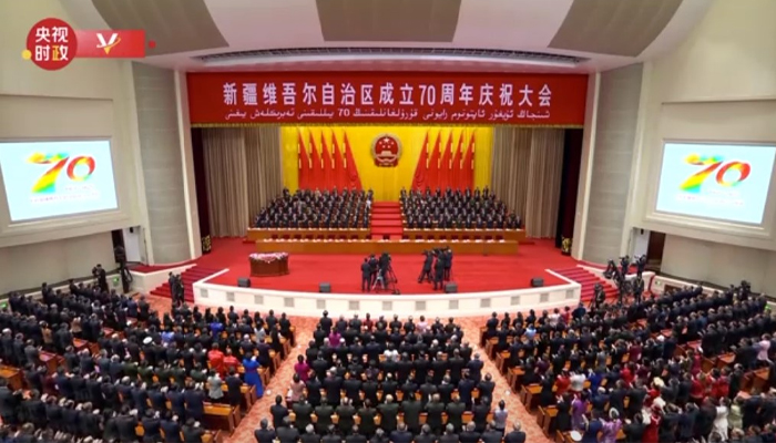سی پی سی سینٹرل کمیٹی کے سیاسی بیورو کے رکن اور مرکزی وفد کے نائب سربراہ لی گان جے نے سی پی سی سینٹرل کمیٹی، قومی عوامی کانگریس، ریاستی کونسل ، سی پی پی سی سی اور مرکزی فوجی کمیشن کی جانب سے سنکیانگ ویغور خود اختیار علاقے کے قیام کی سترویں سالگرہ پر تہنیتی پیغام پڑھ کر سنایا۔ وانگ جو نینگ نے کہا کہ گزشتہ 70 سالوں میں،بالخصوص نئے دور سے، شی جن پھنگ کی مرکزیت پر مبنی سی پی سی سینٹرل کمیٹی نے نئے عہد کے لئے سنکیانگ گورننس کی حکمت عملی طے کرکے سنکیانگ کے تمام امور میں تاریخی کامیابیوں کو فروغ دیا ہے۔ سنکیانگ نےملک کے دیگر علاقوں کے ساتھ مل کر غربت کے خلاف جنگ میں فتح حاصل کی ہے اور جامع طور پر نسبتاً ایک خوشحال معاشرہ قائم کیا ہے۔ سنکیانگ میں تمام قومیتوں کا عظیم اتحاد مضبوط ہو رہا ہے اور چینی قوم کا ہم نصیب معاشرے کا تصور لوگوں کے دلوں میں جڑ پکڑ چکا ہے۔
