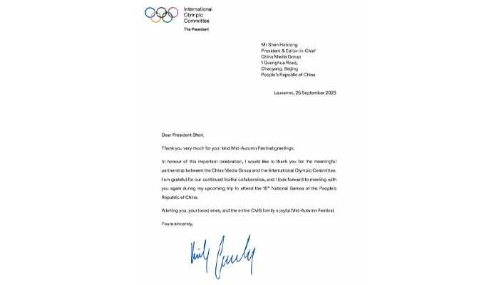 بیجنگ : بین الاقوامی اولمپک کمیٹی کی صدر سیورین کووینٹری نے چائنا میڈیا گروپ کو ایک تہنیتی خط ارسال کیا، جس میں انہوں نے سی ایم جی کے تمام ملازمین کو وسط خزاں تہوار کی مبارکباد پیش کی۔سی ایم جی کے صدر شین ہائی شیونگ کے نام ارسال کردہ خط میں،