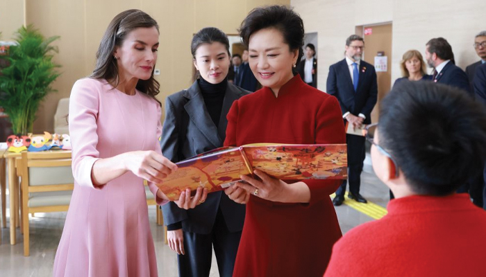 بیجنگ : چینی صدر شی جن پھنگ کی اہلیہ محترمہ پھنگ لی یوان اور چین کے سرکاری دورے پر آئے ہوئے ہسپانوی بادشاہ فلیپے ششم کی اہلیہ ملکہ لیٹیشیا نے بیجنگ میں خصوصی افراد کی خدمات کے نمونہ مرکز کا دورہ کیا۔بدھ کے روز محترمہ پھنگ لی یوان اور ملکہ لیٹیشیا نے مرکز میں خصوصی افراد کی خدمات کے مختلف منصوبوں کے بارے میں معلومات حاصل کیں اور بیجنگ سرمائی پیرالمپکس کی تھیم نمائش دیکھی۔