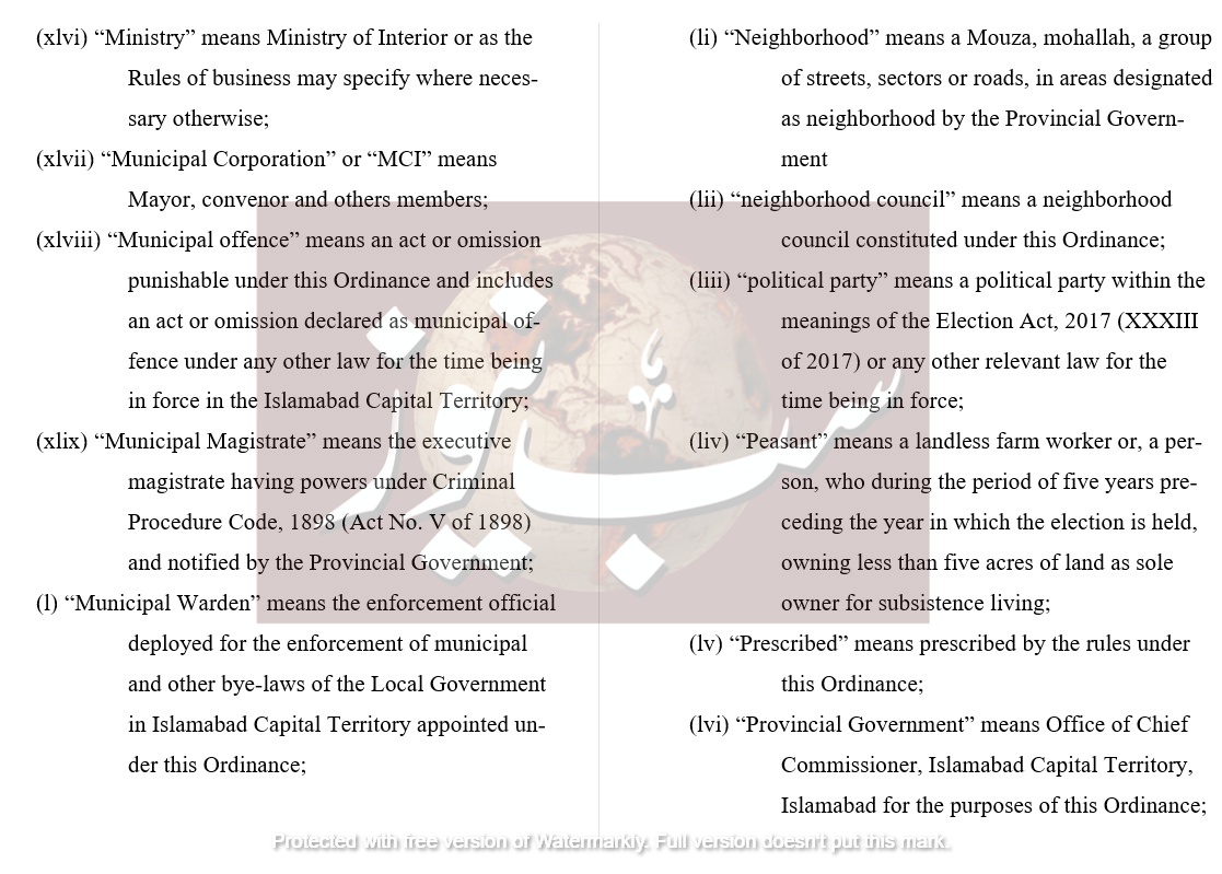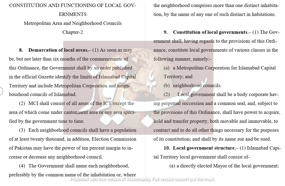 وفاقی حکومت نے اسلام آباد میں بلدیاتی انتخابات کیلئے آرڈیننس جاری کردیا،اسلام آباد میں بلدیاتی انتخابات کیلئے پولنگ الیکٹرانک ووٹنگ مشین سے ہوگی۔آرڈیننس کے مطابق اسلام آباد کے بلدیاتی انتخابات میں آئی ووٹنگ بھی ہوگی،میئر اسلام آباد کی کابینہ 12 رکنی ہوگی۔آرڈیننس کے مطابق میئر اسلام آباد کا انتخاب براہ راست اور4سال کے لیے ہوگا،میونسپل کارپوریشن اسلام آباد کے ارکان کی تعداد 70 ہوگی جبکہ ترقیاتی کام، تعلیم، بنیادی صحت، پبلک ٹرانسپورٹ ایم سی آئی کے حوالے کیے گئے،پارکس، واٹر سپلائی، صفائی کا نظام اور اسٹریٹ لائٹس بھی ایم سی آئی کے حوالے ہوں گے۔آرڈیننس کے مطابق ہر نیبرہڈ کونسل 20 ہزار آبادی پر مشتمل ہوگی،10رکنی نیبرہڈ کونسل میں 5جنرل ممبر، ایک خاتون، ایک مذہبی رکن شامل ہوگا جبکہ نیبرہڈ کونسل میں خواتین کی 2، سینئر سٹیزن اور یوتھ کا ایک ایک نمائندہ ہوگا۔
